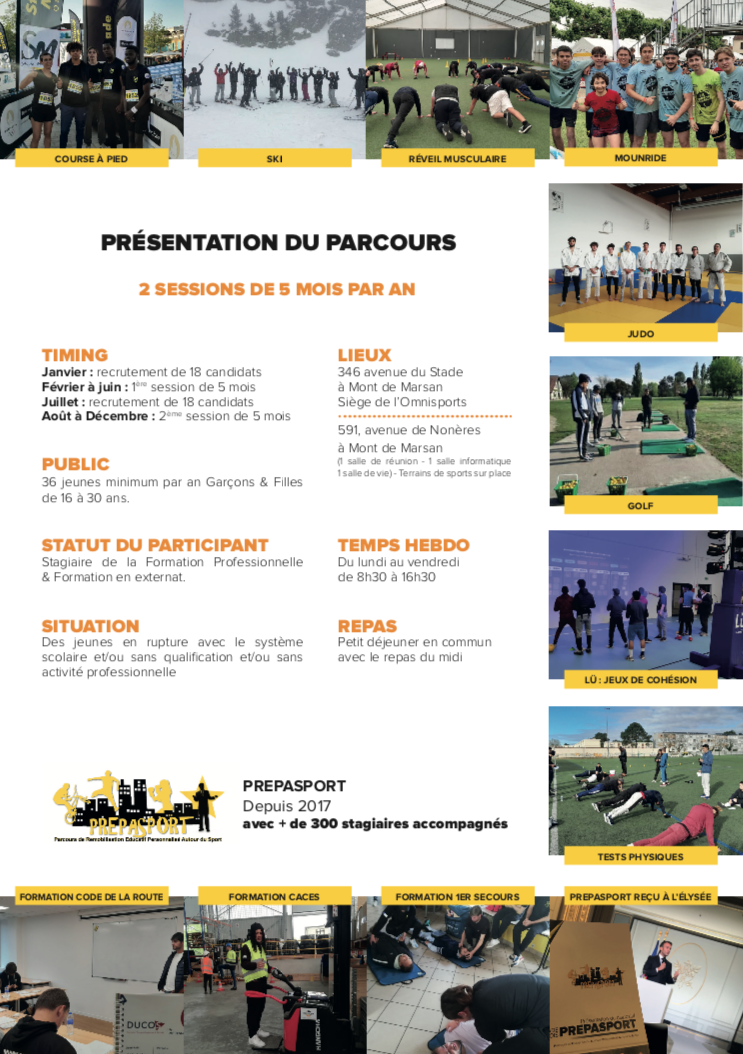 - Des activités sportives ciblées prônant le dépassement de soi et favorisant l’ouverture aux autres (Judo, Cyclisme, Boxe, Canoë-Kayak, Badminton, Golf, Tennis de Table, Tennis, Padel, Football, Hand Ball, Basket, Ski, Surf)